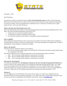 December 1, 2017 letter to all employees in regards to the New York Paid Family Leave. Important information, effective dates, deduction, contacts and resources